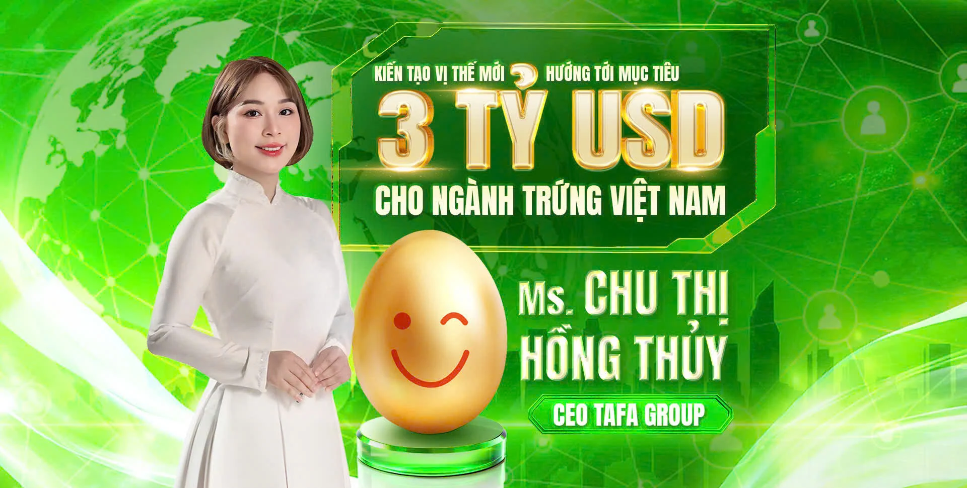 Trong bối cảnh nông nghiệp Việt Nam đang chuyển mình mạnh mẽ để hội nhập sâu rộng, bà Chu Thị Hồng Thủy – CEO TAFA Group (Công ty Cổ phần Tập đoàn Tafa Việt), đã xác định ngành trứng là một lĩnh vực trọng yếu với dư địa tăng trưởng đột phá. Vượt qua những giới hạn của quy mô sản xuất truyền thống, lãnh đạo TAFA Group đang tiên phong hoạch định một chiến lược dài hạn đầy triển vọng: nâng tầm ngành trứng Việt trên chuỗi giá trị toàn cầu, hiện thực hóa cột mốc 3 tỷ USD trong tương lai gần.