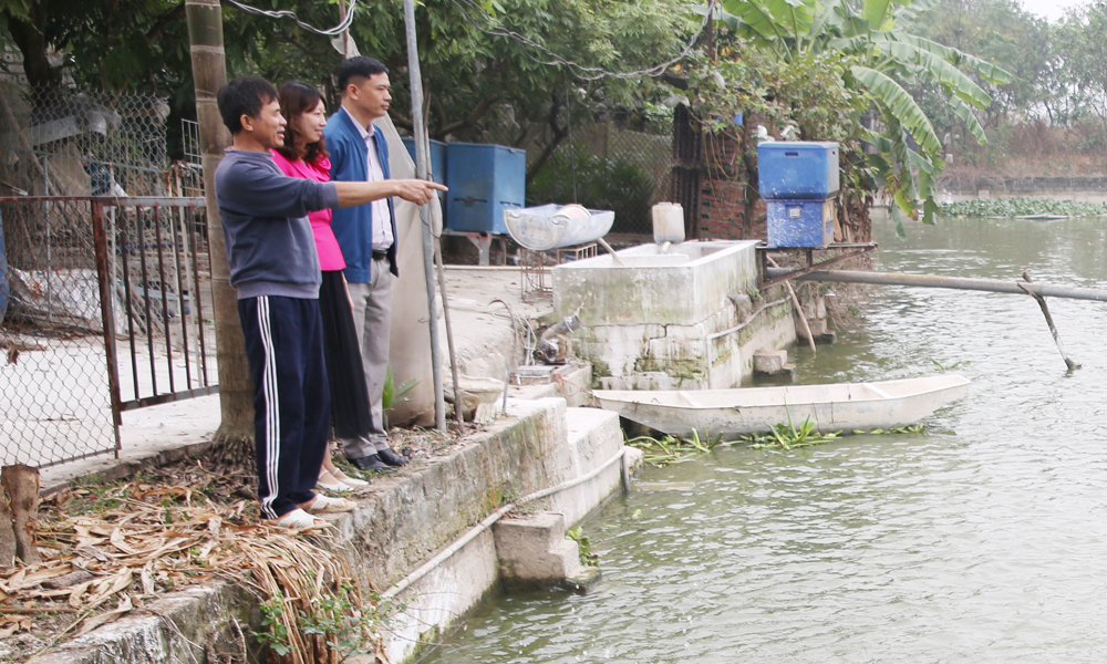 .Cán bộ Chi cục Chăn nuôi, Thú y và Thủy sản tỉnh kiểm tra mô hình nuôi cá rô phi kết hợp chép, trắm cỏ của ông Nguyễn Văn Thủy ở xã Tân Dĩnh.