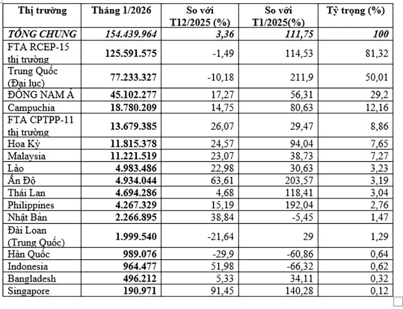 Đứng thứ 2 về kim ngạch là thị trường Campuchia chiếm tỷ trọng 12,16%, đạt trên 18,78 triệu USD, tăng 14,75% so với tháng 12/2025 và tăng 80,63% so với tháng 1/2025.